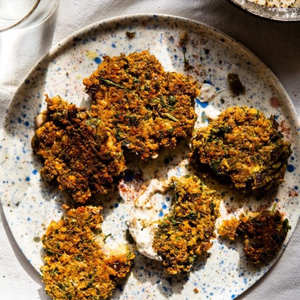Soczewicowe placki z ogórkiem kiszonym i jogurtowym dipem z musztardą francuską