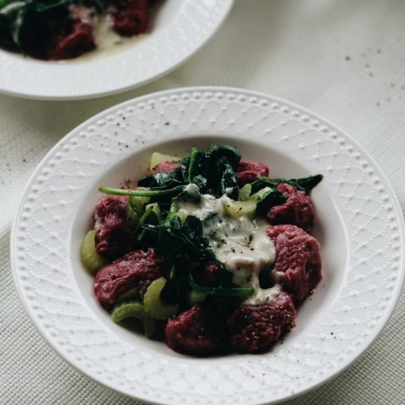 Gnocchi w sosie gorgonzolowym z selerem, szpinakiem i orzechami włoskimi
